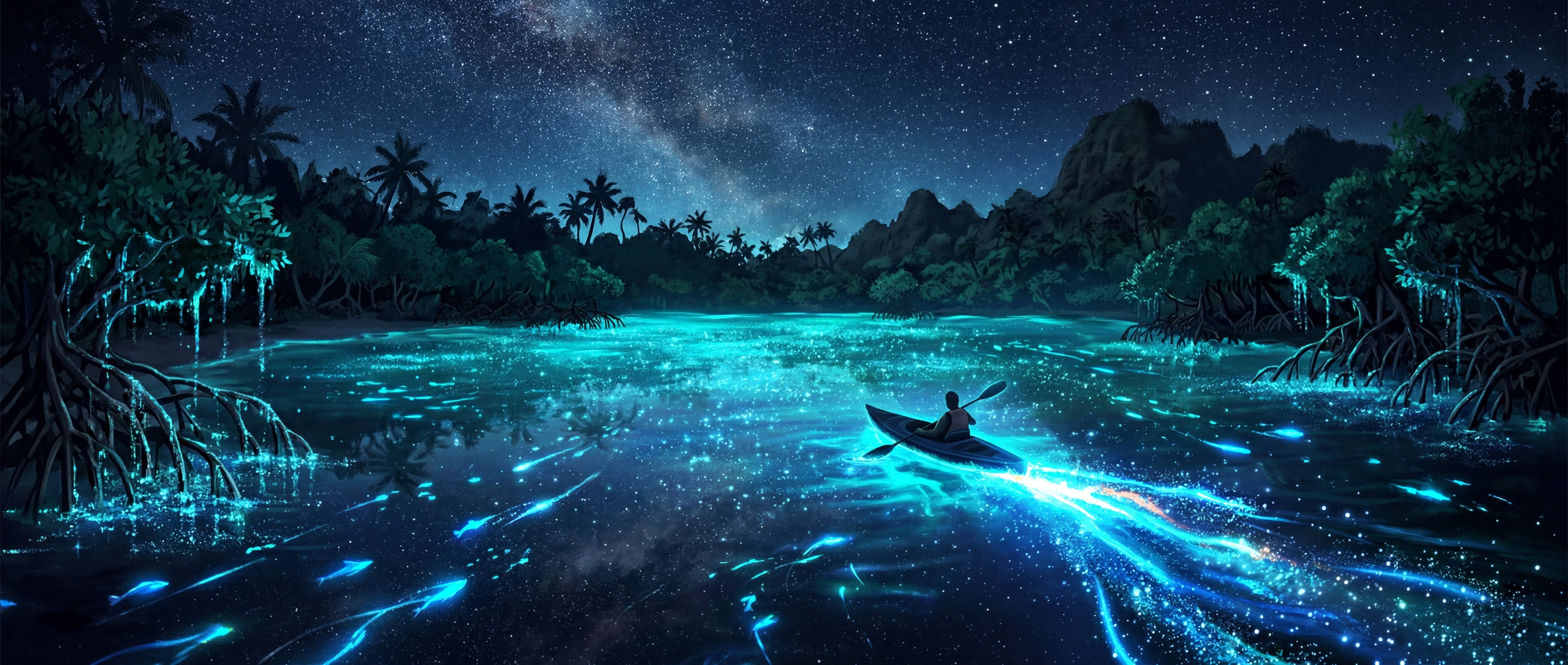 Dip your hand into the water and it erupts in electric blue. Paddle a kayak and the wake burns with light. Fish dart beneath the surface leaving comet trails. In a handful of bays scattered across the tropics, the ocean itself becomes a living light show. Billions of single-celled organisms called dinoflagellates flash blue-green light whenever the water is disturbed. The effect is so intense it looks artificial. It is not. It is 1.5 billion years of evolution, glowing in the dark.